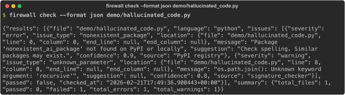 Xác thực code do AI tạo trước khi đưa vào dự án của bạn. Phát hiện API ảo, tham số sai và package không tồn tại trong Python, JavaScript và TypeScript.