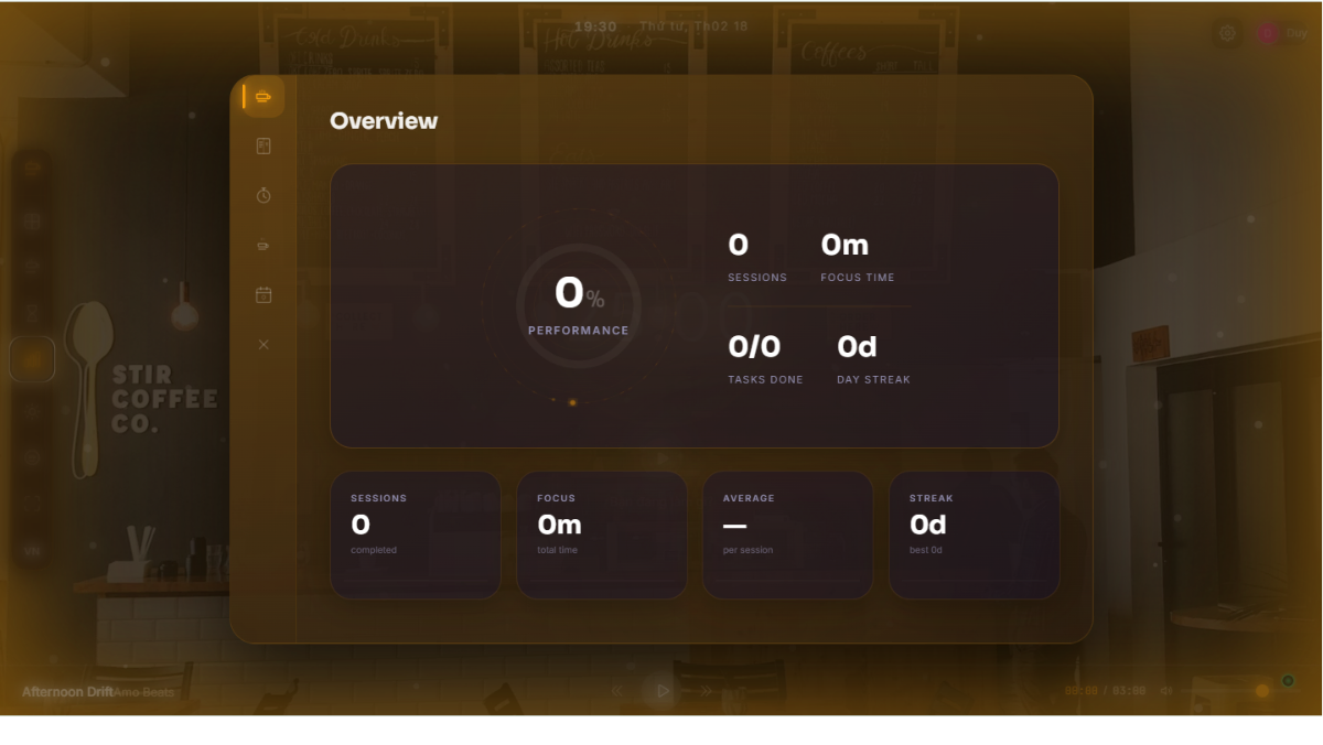 Amo Lofi biến trình duyệt của bạn thành một studio tập trung đẳng cấp, nơi mỗi pixel và mỗi nốt nhạc đều được thiết kế để giúp bạn đạt trạng thái flow — dòng trôi sáng tạo không gián đoạn.
