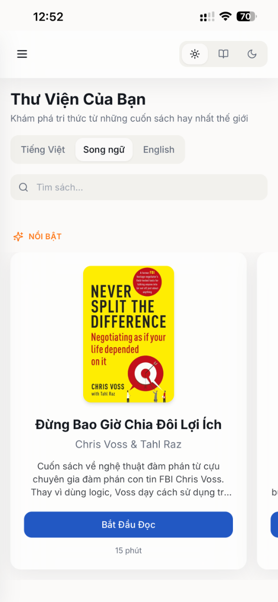 Đọc song ngữ thông minh: Hỗ trợ hiển thị song song hai cột (Tiếng Việt - Tiếng Anh), giúp người dùng vừa tiếp thu kiến thức vừa trau dồi ngôn ngữ.