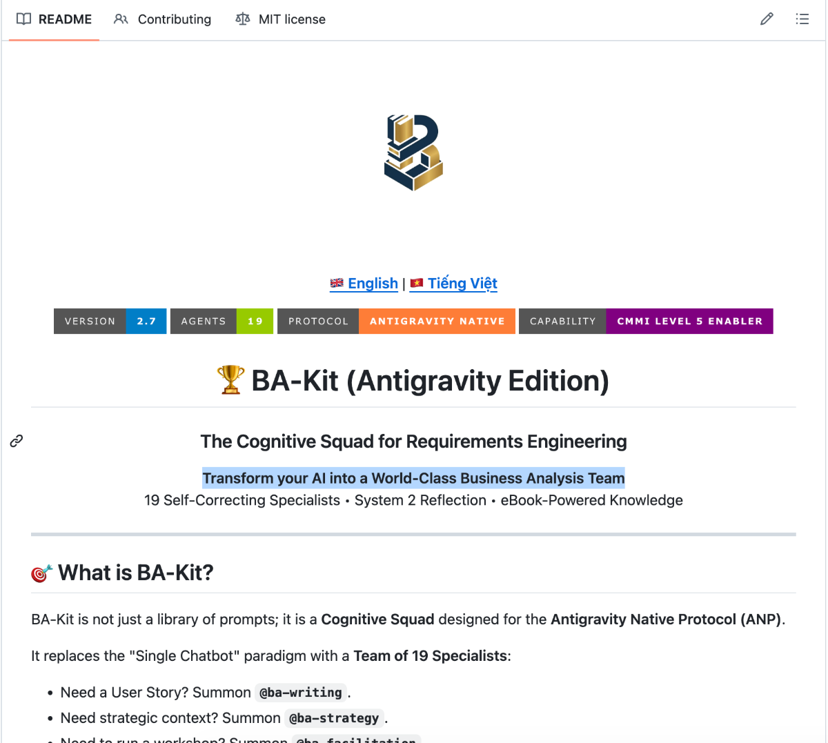 BA-Kit là bộ 19 AI Agent đóng vai trò chuyên gia Phân tích Nghiệp vụ, chạy trực tiếp trên nền tảng Google Antigravity. Công cụ này tự động xử lý toàn bộ vòng đời phân tích tính năng, kể cả khi bạn chưa từng tự tay viết một bản đặc tả hay vẽ biểu đồ luồng nghiệp vụ.