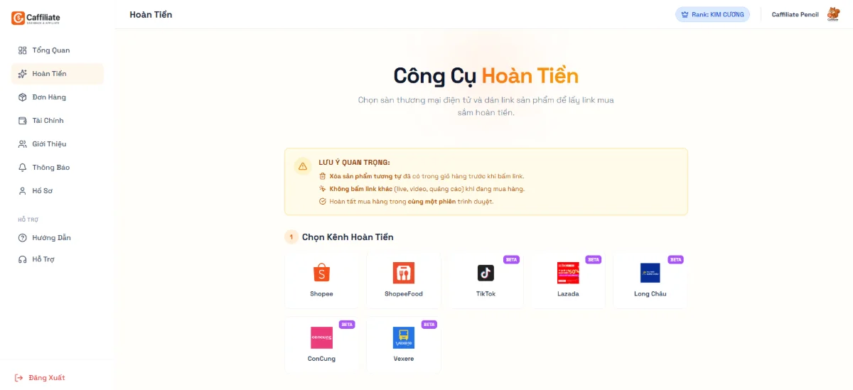 Sau khi đơn hàng hoàn tất và kết thúc thời gian đối soát từ sàn thương mại điện tử, Caffi phân phối lại phần lớn hoa hồng cho người dùng dưới dạng cashback theo hạng tài khoản.
