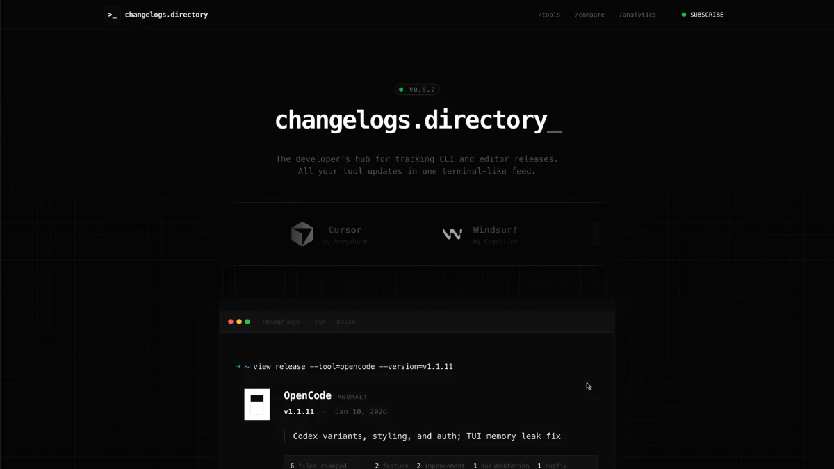 Bản dịch tự động ·Theo dõi các phiên bản, tính năng và sự thay đổi quan trọng trên các công cụ lập trình AI như Claude Code, Codex, Cursor và nhiều hơn nữa - trong một nguồn cấp dữ liệu có thể tìm kiếm và lọc theo phong cách terminal