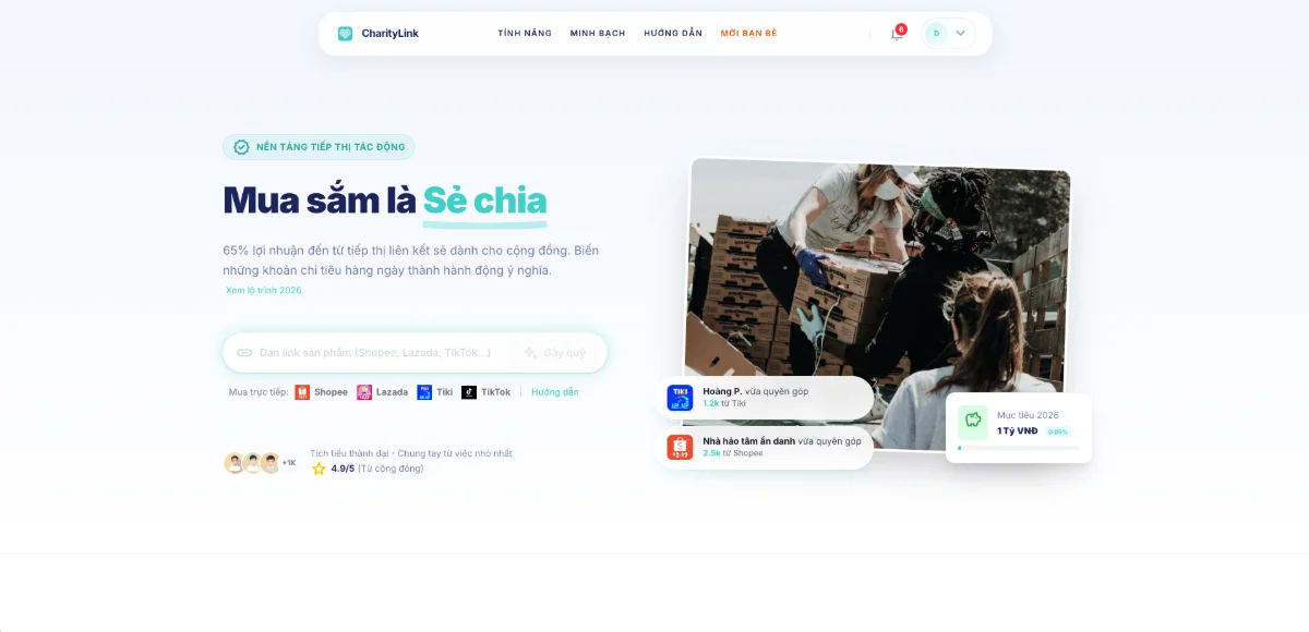 Chào mọi người, mình là founder của CharityLink đây. Cảm ơn các bạn đã quan tâm và đồng hành cùng dự án trong suốt thời gian qua ❤️ CharityLink được tụi mình xây dựng với mong muốn: Biến việc làm thiện nguyện trở nên Đơn giản – Minh bạch – Ai cũng làm được. Không cần phải quyên góp số tiền lớn, chỉ cần mọi người dán link mua sắm (Shopee, Lazada, Tiki...) vào CharityLink rồi mua như bình thường. Toàn bộ quá trình là tự động, một phần hoa hồng từ đơn hàng sẽ được trích trực tiếp vào quỹ từ thiện, hoàn toàn minh bạch và công khai. Bạn mua được món đồ mình cần, còn cộng đồng nhận được sự sẻ chia. Bên cạnh niềm vui làm việc tốt, CharityLink còn có hệ thống Tích điểm (Charity Points) và bảng thành tích để mỗi đóng góp nhỏ của bạn đều được ghi nhận xứng đáng. Dùng càng thường xuyên, lan tỏa càng nhiều thì quỹ từ thiện càng lớn mạnh. CharityLink vẫn đang được tụi mình hoàn thiện và cải tiến mỗi ngày. Rất mong mọi người trải nghiệm và tiếp tục ủng hộ để hành trình nhân ái này đi được thật xa 🙏