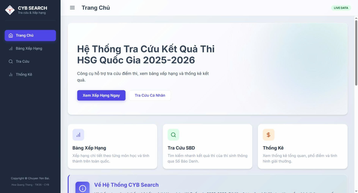 Chào mừng bạn đến với CYB SEARCH - Cổng thông tin tra cứu và phân tích kết quả thi Học sinh giỏi Quốc gia (HSGQG) năm 2026. Đây là công cụ đắc lực dành cho học sinh, giáo viên và các bậc phụ huynh để cập nhật kết quả thi một cách nhanh chóng, chính xác và trực quan nhất.