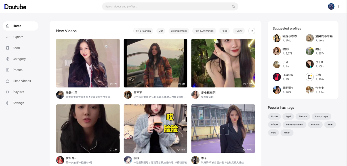 Discover content: Explore videos via home feed, trending, top, categories, and author pages.