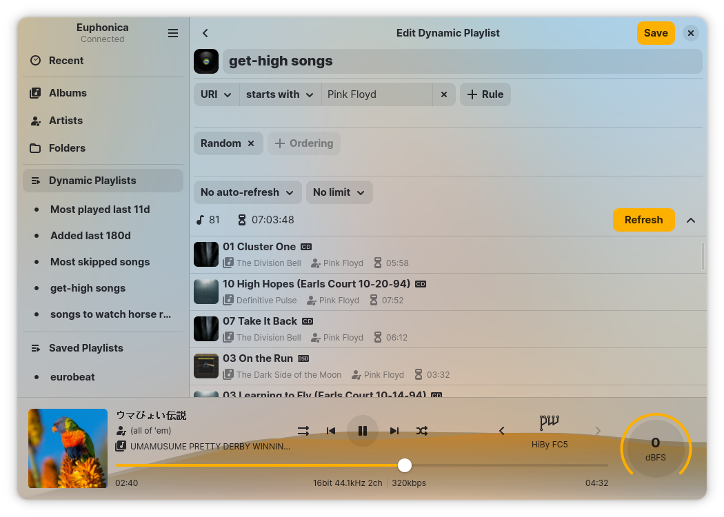 Giao diện người dùng GTK4+libadwaita thích ứng cho hầu hết các tính năng của MPD, từ sắp xếp hàng đợi và ReplayGain đến cấu hình crossfade và MixRamp.