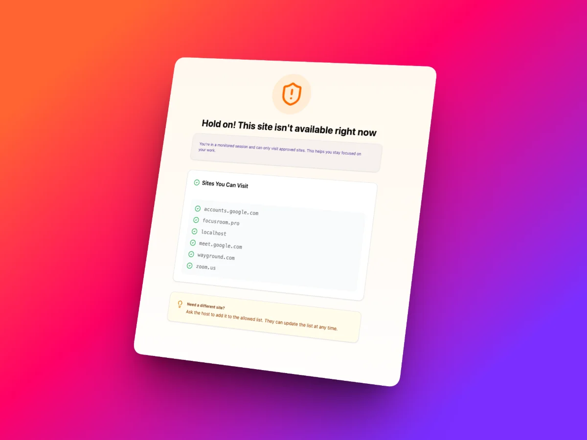 Sự phân tâm giết chết năng suất. FocusRoom cho phép bạn tạo các phiên làm việc có giám sát với danh sách trắng các trang web, theo dõi vi phạm lướt web trong thời gian thực, và giữ mọi người tập trung vào nhiệm vụ.
