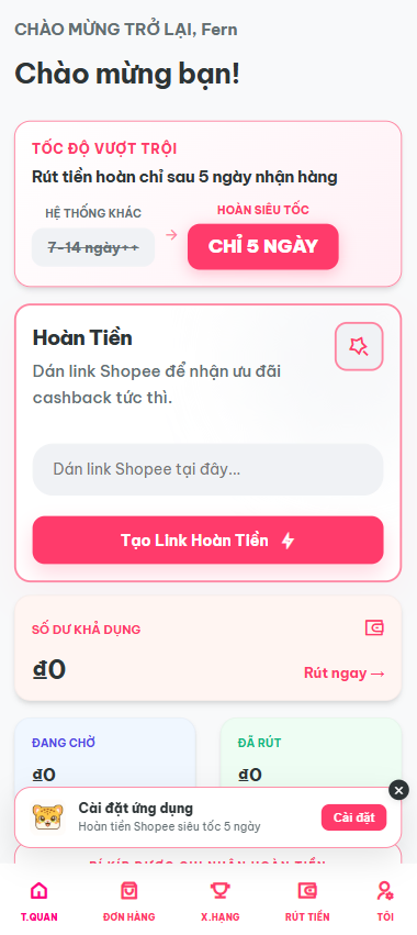 Ứng dụng cho phép dán link sản phẩm để tạo liên kết hoàn tiền trong vài giây. Người dùng tiếp tục mua sắm trực tiếp trên sàn như bình thường, hệ thống sẽ tự động ghi nhận đơn hàng hợp lệ và phát sinh cashback.