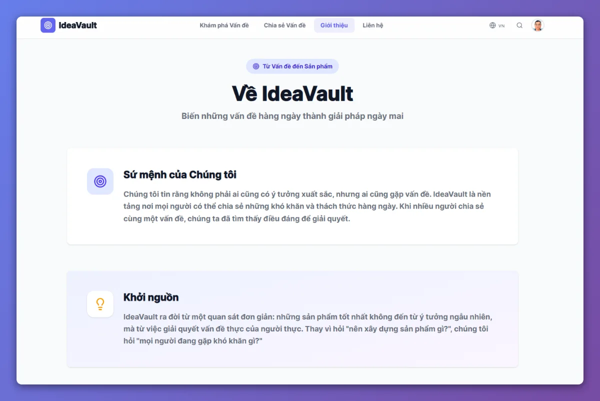 IdeaVault ra đời từ một quan sát đơn giản: những sản phẩm tốt nhất không đến từ ý tưởng ngẫu nhiên, mà từ việc giải quyết vấn đề thực của người thực. Thay vì hỏi "nên xây dựng sản phẩm gì?", chúng tôi hỏi "mọi người đang gặp khó khăn gì?"