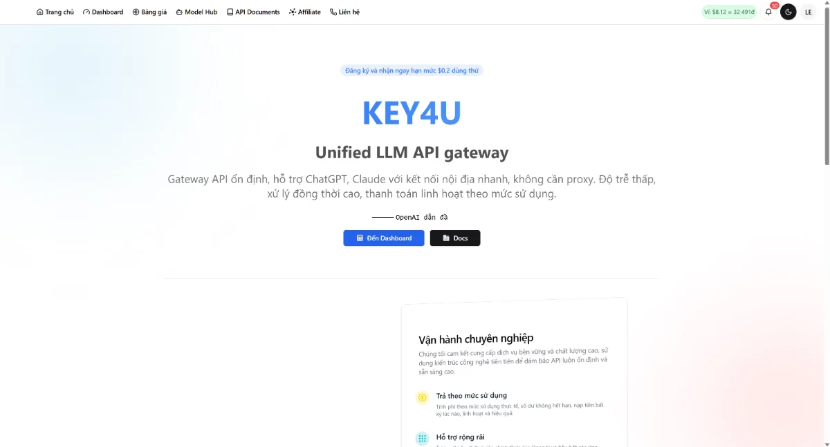 Key4U.shop – Nền tảng API AI đa mô hình hàng đầu Việt Nam