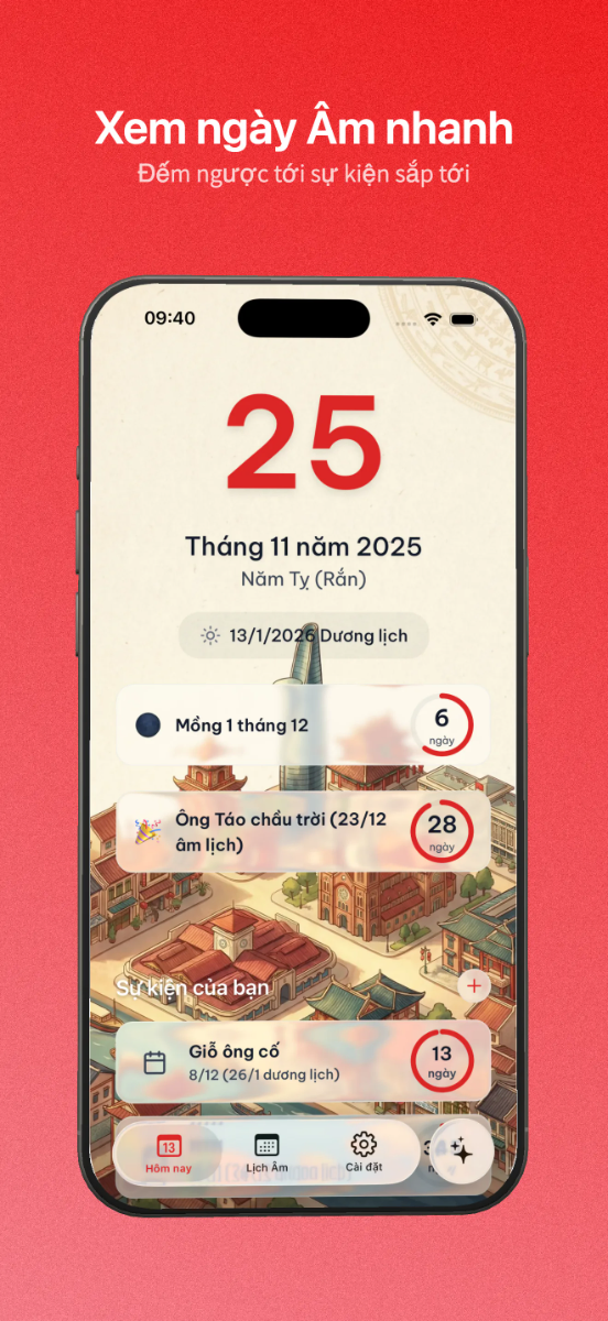 Ứng dụng Lịch Âm đầu tiên kết hợp trí tuệ nhân tạo (AI) để mang lại trải nghiệm xem lịch chính xác và cá nhân hóa nhất cho người Việt. Không chỉ là cuốn lịch âm truyền thống, Lịch Ta là trợ lý phong thủy đắc lực, giúp bạn làm chủ thời gian và vận mệnh trong năm mới.