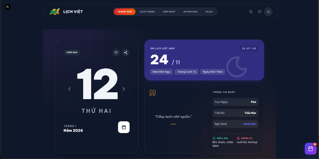 Sản phẩm hướng tới việc mang lại trải nghiệm tra cứu lịch truyền thống với phong cách công nghệ hiện đại, giúp bạn dễ dàng lên kế hoạch cho công việc và cuộc sống.