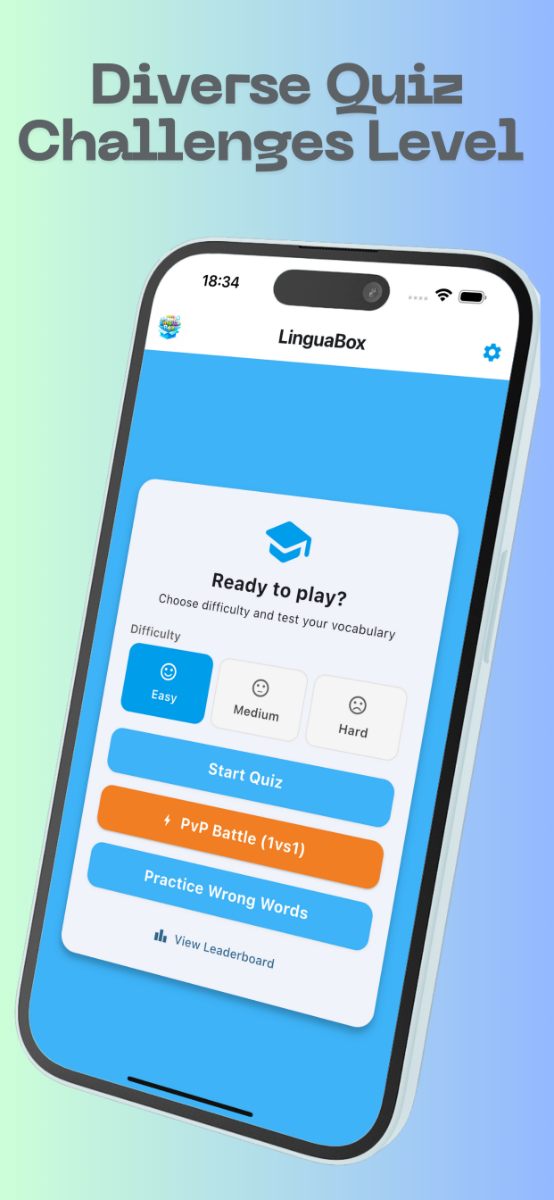 Nâng cao kỹ năng ngôn ngữ của bạn với LinguaBox, ứng dụng vui nhộn và hấp dẫn được thiết kế để biến việc học từ vựng thành một cuộc phiêu lưu thú vị. Cho dù bạn là người học thông thường hay sinh viên thích cạnh tranh, LinguaBox đều cung cấp môi trường hoàn hảo để kiểm tra kiến thức của bạn và leo lên bảng xếp hạng toàn cầu!