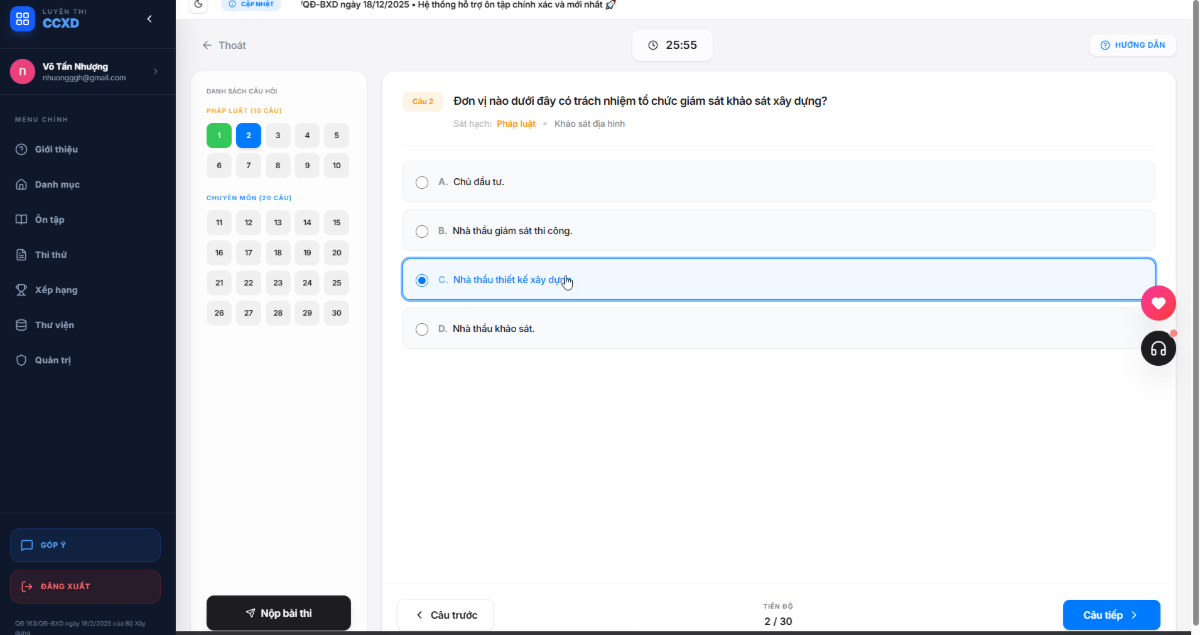 Hệ thống Luyện thi Chứng chỉ Hành nghề Xây dựng (CCXD) là giải pháp ôn tập toàn diện giúp các kỹ sư và kiến trúc sư chuẩn bị tốt nhất cho kỳ thi sát hạch.