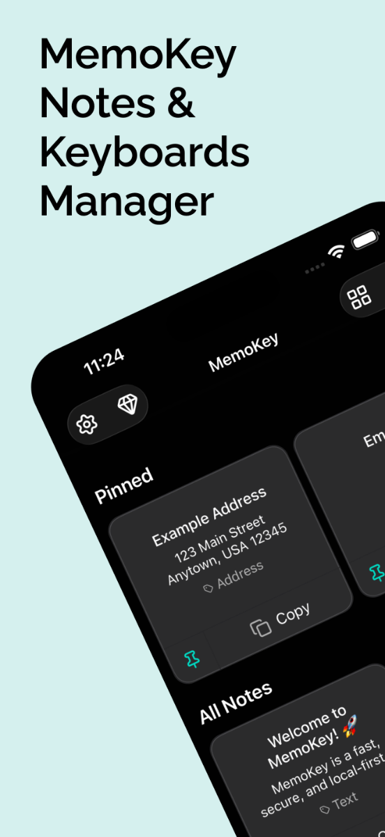 MemoKey giúp bạn truy cập ghi chú, đoạn văn, mẫu tin và hashtag trực tiếp ngay trên bàn phím trong bất kỳ ứng dụng nào. Không cần chuyển app để sao chép và dán nữa. Tất cả chỉ cách bạn một lần chạm.