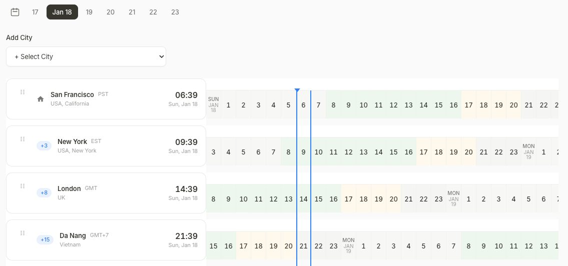Bạn thêm các thành phố, và công cụ hiển thị giờ địa phương của chúng trên một timeline duy nhất. Khi là 9 giờ sáng ở San Francisco, bạn có thể thấy đó là 5 giờ chiều ở London và 1 giờ sáng ngày mai ở Singapore.