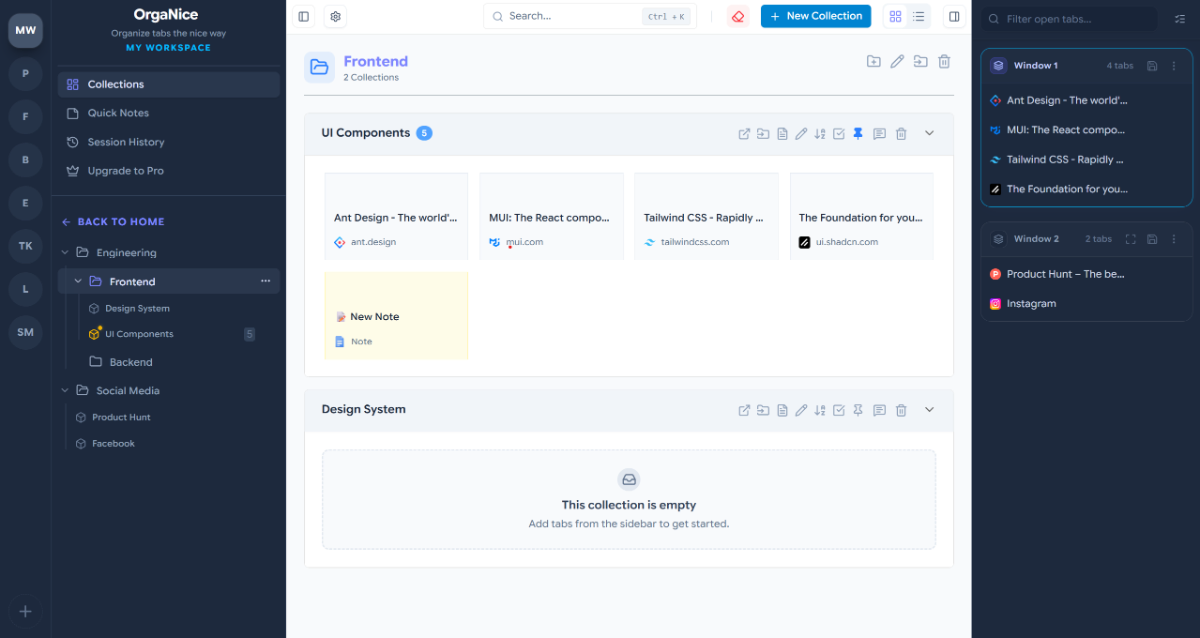 OrgaNice là công cụ giúp bạn quản lý tab trình duyệt bằng Workspace (không gian làm việc), Collections (bộ sưu tập) và thư mục lồng nhau không giới hạn, để bạn luôn giữ được sự tập trung và tìm thấy mọi thứ chỉ trong vài giây.
