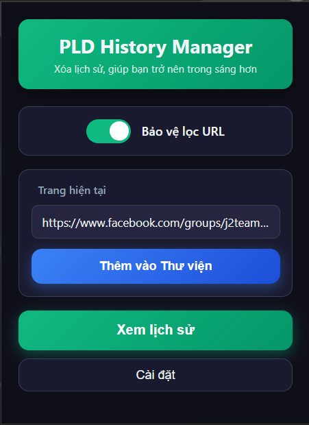 Giới thiệu chung: PLD History Manager là giải pháp bảo mật trình duyệt toàn diện, được thiết kế để bảo vệ quyền riêng tư của người dùng và quản lý dữ liệu duyệt web một cách chuyên nghiệp. Khác với các công cụ xóa lịch sử thông thường, tiện ích này hoạt động theo thời gian thực (real-time) để đảm bảo không một dấu vết nhạy cảm nào bị lưu lại trên trinh duyệt.