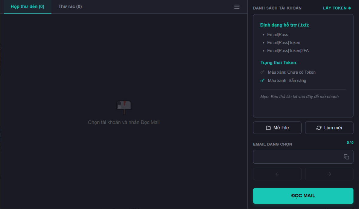 ✔️ Quản lý danh sách: Hỗ trợ nhập (Import) list tài khoản và chuyển đổi nhanh giữa các email.