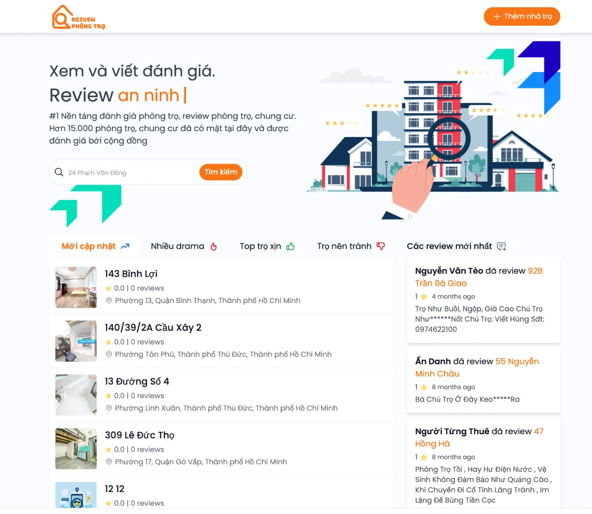 Reviewphongtro.com - Nền tảng đánh giá phòng trọ, review phòng trọ, chung cư số 1 Việt Nam. Hơn 15.000 phòng trọ,chung cư đã có mặt tại đây và được đánh giá bởi cộng đồng.