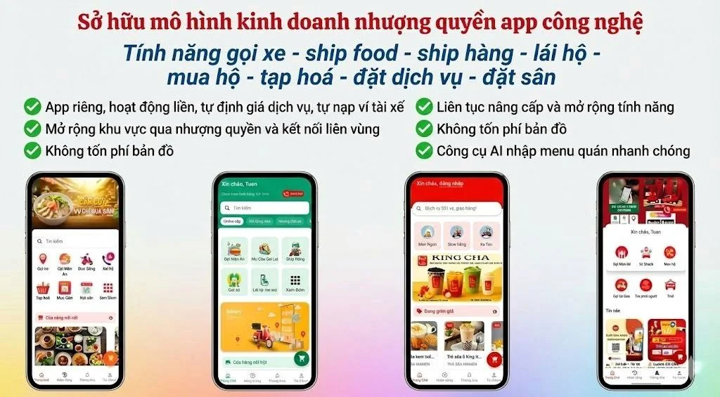 Giải pháp SAAS cho phép tạo nhanh ứng dụng riêng cho các doanh nghiệp địa phương trong mảng gọi xe - gọi đồ ăn - lái về khi say - thuê xe - xe ghép - TMDT - đặt lịch dịch vụ - đặt sân. Kết nối liên ứng dụng và liên vùng giữa các ứng dụng nhỏ lẻ.