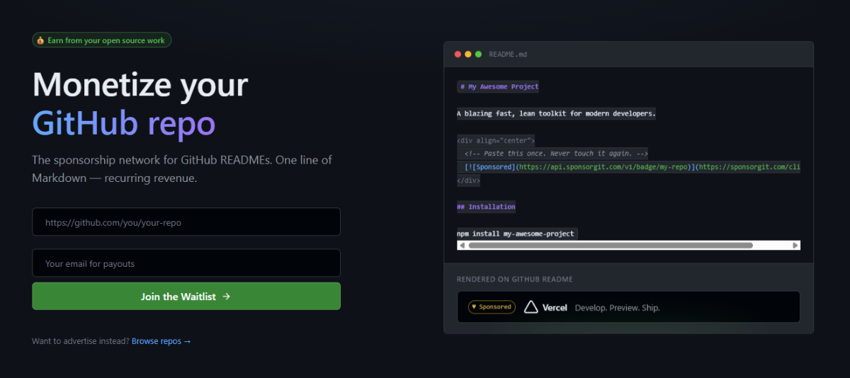Sponsorgit giúp developer có thể kiếm tiền từ các dự án opensource của mình trên github bằng cách kết nối với những delopver khác có nhu cầu quảng cáo sản phẩm liên quan.