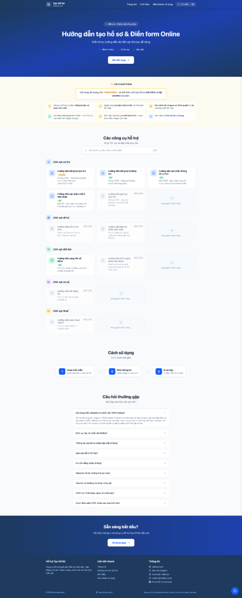 TaoHoSo.com là nền tảng hỗ trợ tạo mẫu đơn và hồ sơ thủ tục hành chính trực tuyến như đăng ký tạm trú, thường trú, sang tên sổ hồng,… giúp người dân chuẩn bị giấy tờ nhanh chóng, chính xác và hoàn toàn miễn phí.