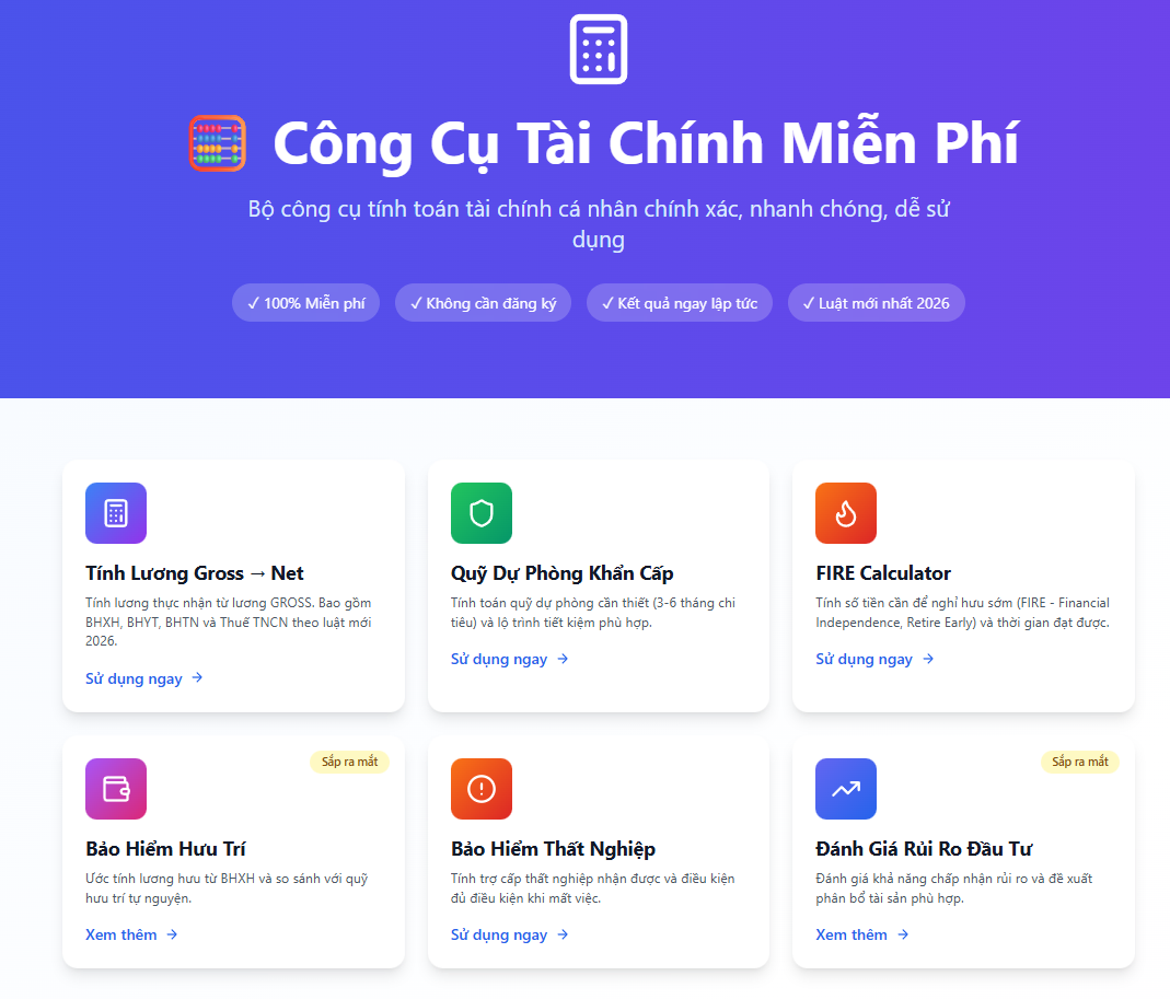 Giúp bạn xác định mục tiêu FIRE, tính toán thời điểm đạt tự do tài chính và theo dõi lộ trình tiết kiệm – đầu tư theo từng năm.