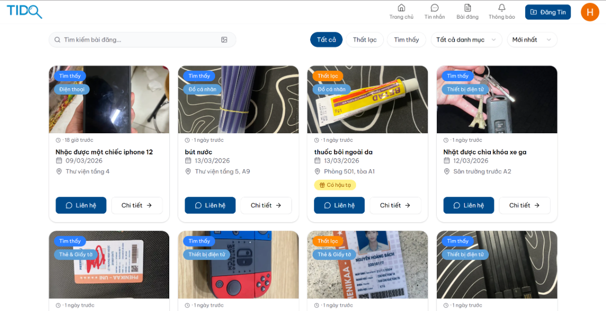 🔍 Bộ lọc & Tìm kiếm mạnh mẽ: Phân loại rõ ràng theo danh mục (thẻ, ví, chìa khóa...), trạng thái (Mất/Nhặt được), giúp bạn tra cứu trong tích tắc. Đặc biệt hệ thống còn hỗ trợ tìm kiếm bằng hình ảnh.