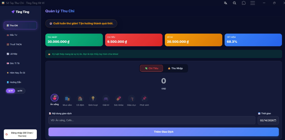 Đăng nhập để bình luậnChào mọi người! Mình là Admin của dự án Ting Ting Về Ví. Trước đây, mỗi khi muốn tra cứu thuế TNCN, tính lãi kép hay quản lý thu chi, mình lại phải lọ mọ lên Google tìm kiếm nhiều trang web khác nhau. Chính vì vậy, mình đã nảy ra ý tưởng tích hợp tất cả các công cụ cần thiết vào làm một để tiết kiệm thời gian và tối ưu hóa trải nghiệm. Điểm đặc biệt của app là bộ công cụ Tính Thuế TNCN cập nhật mới nhất 2026 và Máy tính Lãi kép giúp các bạn hoạch định tài chính rõ ràng hơn. Admin rất mong nhận được góp ý từ cộng đồng. Nếu thấy hữu ích, hãy ủng hộ mình 1 Upvote nhé! Cảm ơn mọi người! 🥰