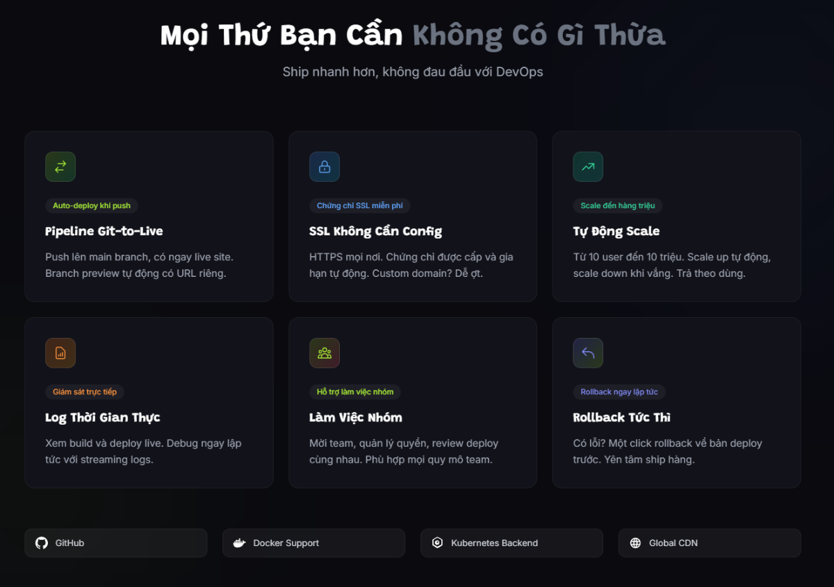 Mục tiêu đơn giản là giúp mọi người (hoặc không phải người) quên đi sự rắc rối của DevOps (VPS, Docker, K8S) và có thể tập trung vào việc build sản phẩm.