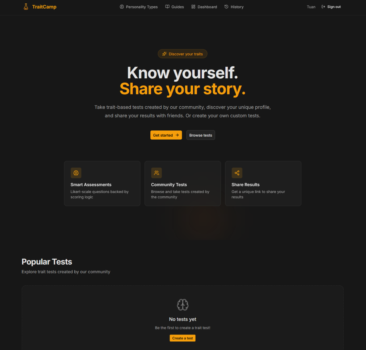 TraitCamp là nền tảng cho phép cộng đồng tạo, chia sẻ và thực hiện các bài trắc nghiệm tính cách tùy chỉnh. Người dùng có thể thiết kế bài kiểm tra với thang đo Likert, xem kết quả phân tích chi tiết, chia sẻ kết quả qua đường dẫn, và theo dõi lịch sử làm bài.