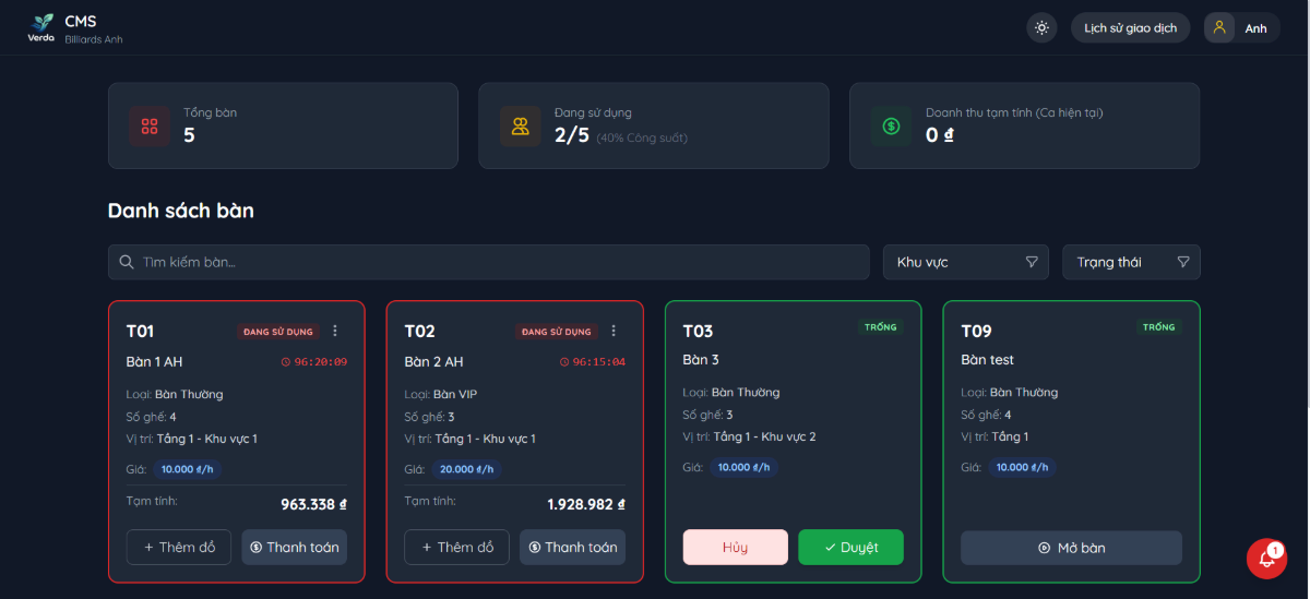 Chào mừng bạn đến với Verda CMS – Giải pháp công nghệ "Tất cả trong một" được thiết kế chuyên biệt để giải quyết 100% các nỗi đau của chủ quán Billiards và nhà hàng. Không chỉ là một phần mềm tính tiền, order, quản lý kho Verda CMS còn là "người quản lý" mẫn cán hoạt động 24/7 giúp tối ưu lợi nhuận cho cơ sở của bạn.