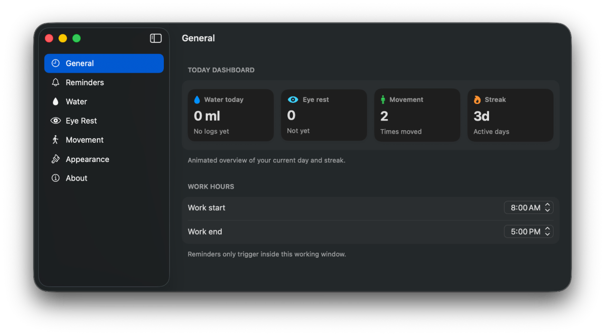 WorkWell is a macOS app that reminds you to stay hydrated, rest your eyes (20–20–20 rule), and take short movement breaks—designed for desk workers, developers, designers, and students...