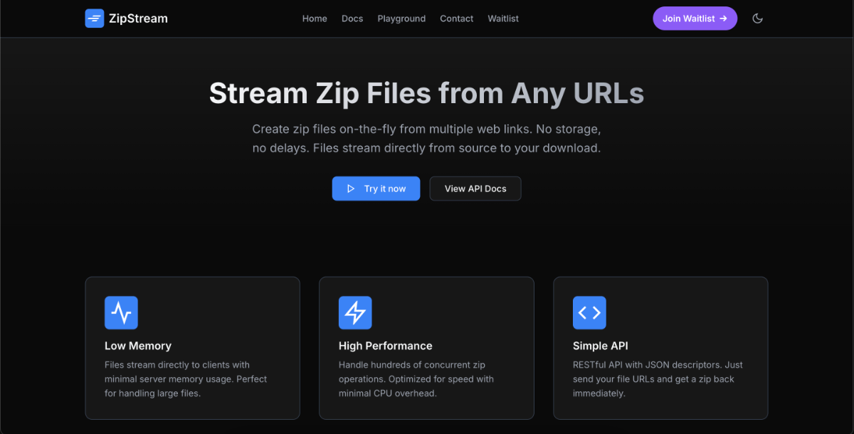 ZipStream is a service for creating zip files on-the-fly from multiple web URLs. Instead of downloading files to a server first and then zipping them, ZipStream streams files directly from their source URLs into a zip archive that's delivered to your browser.
